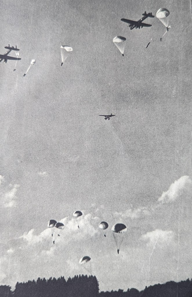 On falling through the hole your legs are immediately blown ‘sidewards by the slip stream and you find yourself parallel to the ground. A moment later there is a nibbling feeling at your shoulders; the canopy has opened, but the jerk is no harder than that made by a fair-sized trout when you hook it. After that, all sensation of falling ends. When near the ground, it is the earth moving up to meet you and not you meeting the earth, which you notice.” The landing is no light matter. Only those who have jumped off the roof of a slowly-moving train can have an idea of what it is like. It was troops trained on these lines who seized the North African airfields and formed the spearhead of the First Army. The pilots of the aircraft carrying the airborne troops must be most exactly trained. They have to drop live bodies, not live bombs; and while a bomb may do much damage even if it does not fall directly on the target, an airborne soldier can effect nothing and will in all probability very swiftly become a casualty unless he is dropped exactly in the right place and in the company of all or most of his comrades.