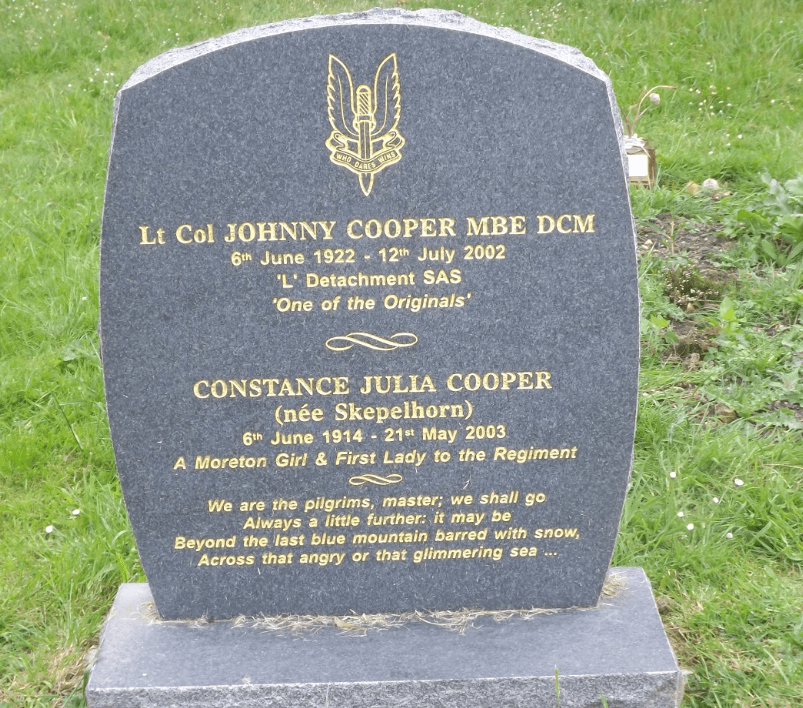 The gravestone of Lt Col Johnny Cooper MBE DCM.