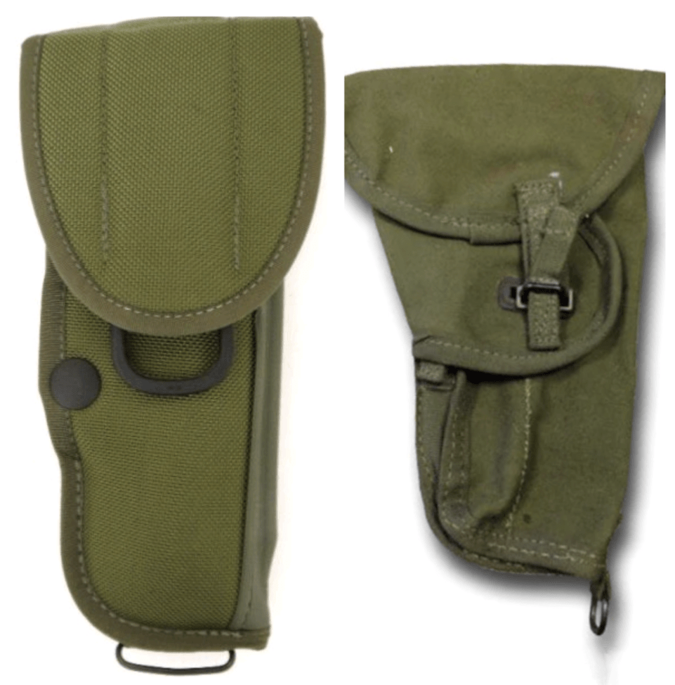 - 9mm Browning pistol. The only holster on issue at this time was the 58 pattern which was useless. Many carried their pistol in the inside pocket of a smock (those with an intense fear of losing it would stow it in the top flap of their grab back or bergen for the duration of the exercise). One magazine was fitted to the weapon and a spare usually carried in another pocket to prevent noise. Not ideal but if captured you may have had a chance of getting the weapon through a first cursory search depending on the quality and training of the soldier. On a visit to the American PX Bianchi holsters could be bought, these were good for the time and had a flexible clip system for belt kit attachment. Others tried commercially purchased shoulder holsters, but I thought them impractical.