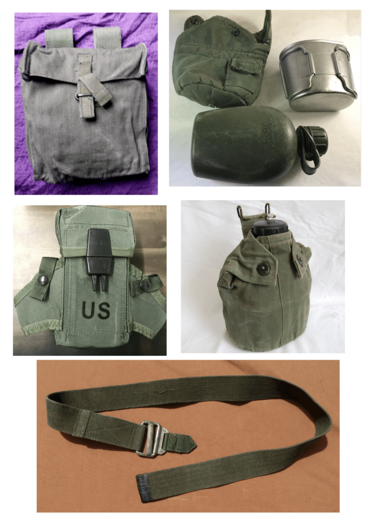 Constructed from canvas that shrunk when wet, the various pouches fastened to the belt and yoke by a series of open metal clips that slotted into inserts on the belt. The clips had to be crushed into place by a pair of pliers otherwise you had the embarrassment of an ammo pouch springing free at an inappropriate moment and usually in front of the Battery Sergeant Major. Experienced soldiers would tie the pouches on with cord to prevent this happening.