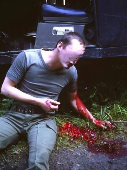 Trauma Kit. SOP dictated these items had to be carried in the top left smock pocket. 2 first field dressing (FFD). 2 x crepe bandage as the bandages on the FFD would be torn off and crepe bandages used instead. This meant more wound pressure could be applied. Mucus extractor. No tourniquets issued and improvisation was taught. Looking back the use of tourniquets would fall in and out of favour in conventional training. We were always taught to use them especially after attending the ILRRPS Patrol Medic course. Many of the instructors were US Army with combat experience in Vietnam and had practical experience of the use of tourniquets.
