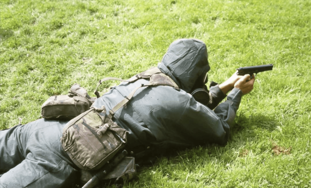 - Respirator pouch. Contained S6 later S10 respirator, detection paper and decontamination powder and blotting pads (DKP 1 & 2). Some chose to have a second respirator pouch on their belt for their NBC suit but this made it very bulky. The upside was that you didn’t have to wrestle it into a 58 pattern NBC roll that would sit on top of your webbing. Others just carried it in their daysack.