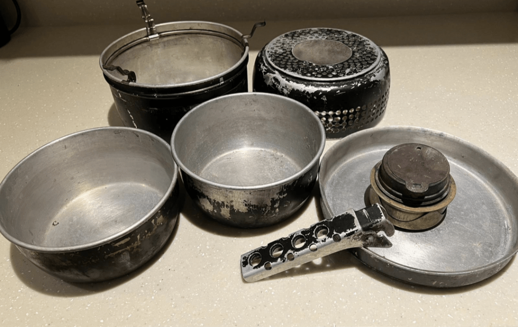 - 24 hr rations, cooker and fuel. Food was usually enough for one main meal with snack items such as chocolate and AB biscuits. Plentiful brew kit was always carried. Trangia (reliable and robust though not fuel efficient in cold weather) or peak (efficient and quick but tempermental) stoves were popular.