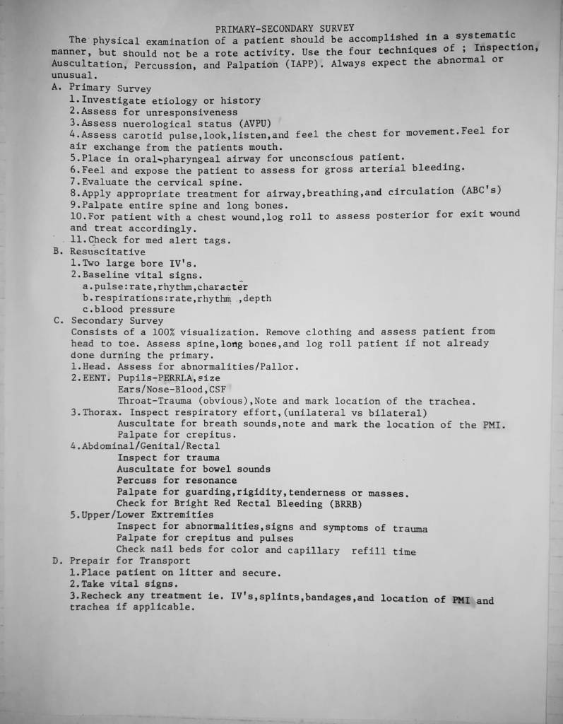 Mine had an obvious injury, a gunshot or fragmentation wound. Naturally he was deemed as unconscious, so no feedback on history of events before you reached the casualty. I started what was then called a primary survey. Most of the terms came from  American  first aid procedures. ABC, Airway, Breathing, Circulation. Airway clear, then start at the head, feel, look, check. C7, the top 7 vertebrae to the skull, any abnormalities, does his neck have to be secured? If so, secure the head, scan down the body etc. This check was fairly rapid, the more obvious wound was detected and dealt with. An air way secured, and an IV established.  Normally now the secondary survey would take place. This was detailed survey top to toe. It was at this point you would discover another problem. Normally the result of an internal injury, hidden from view. Information was fed to you rapidly. Pulse increasing. BP dropping. Twitching, Casualty gasping etc. Your mind would race to find the problem. If you diagnosed the  symptoms correctly  and reacted correctly the casualtys condition would improve. Once the casualty was more or less stabilised, more questions would follow concerning long-term treatment, or on drugs and dosages. After about what seemed a lifetime, but in reality, was about 15 minutes, the examiners would stop the exercise. But would not inform you until the end if you had passed.